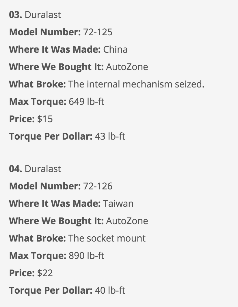 The load was applied on a 1 foot fulcrum so the measurement was easily come up with instead of using any formulas that could be brought into suspect. This test would show the maximum torque before the wrenches would break much like when you put a cheater bar on to multiply the force. That and no impact was used to change the true amount of force being applied.
