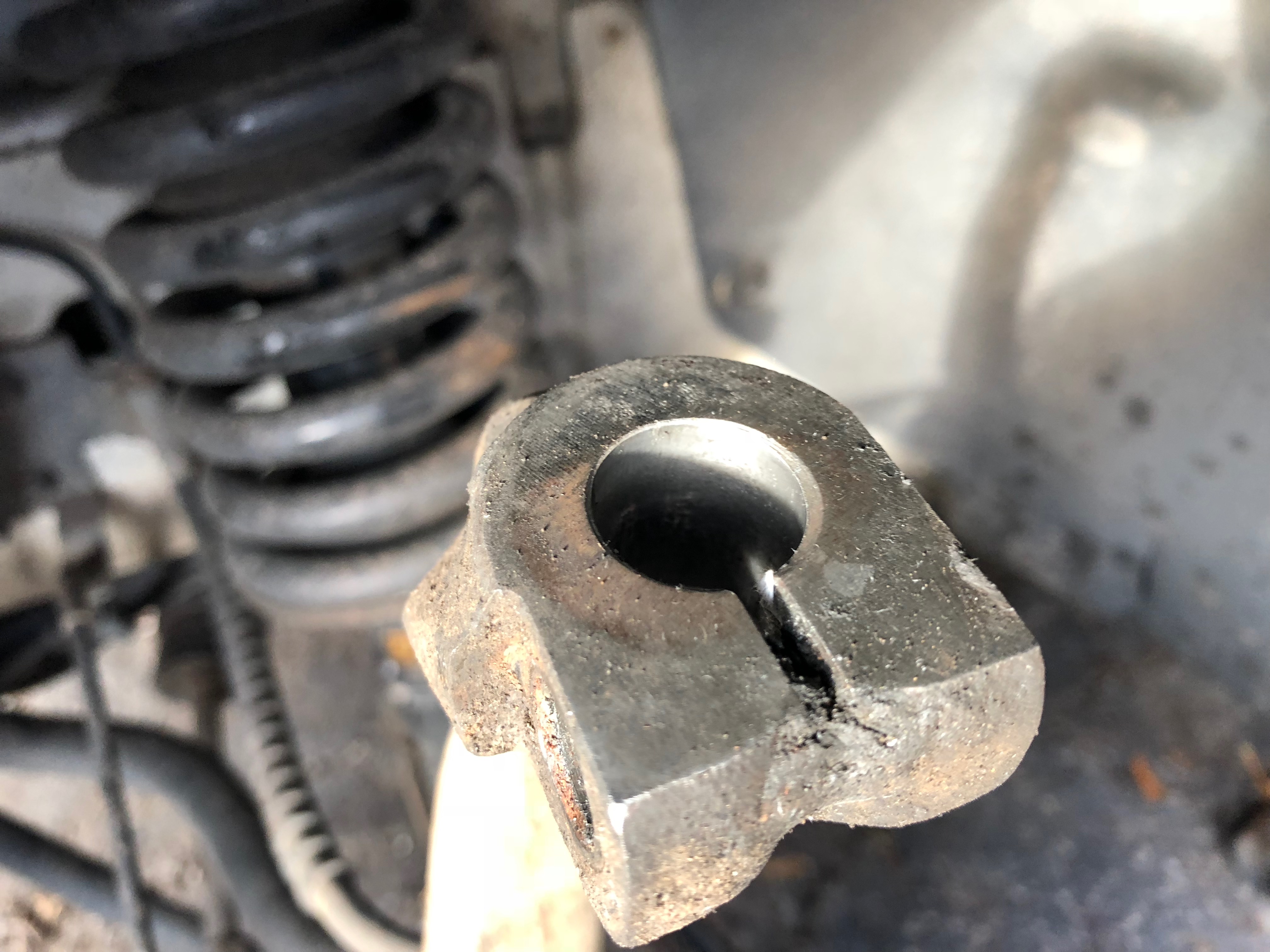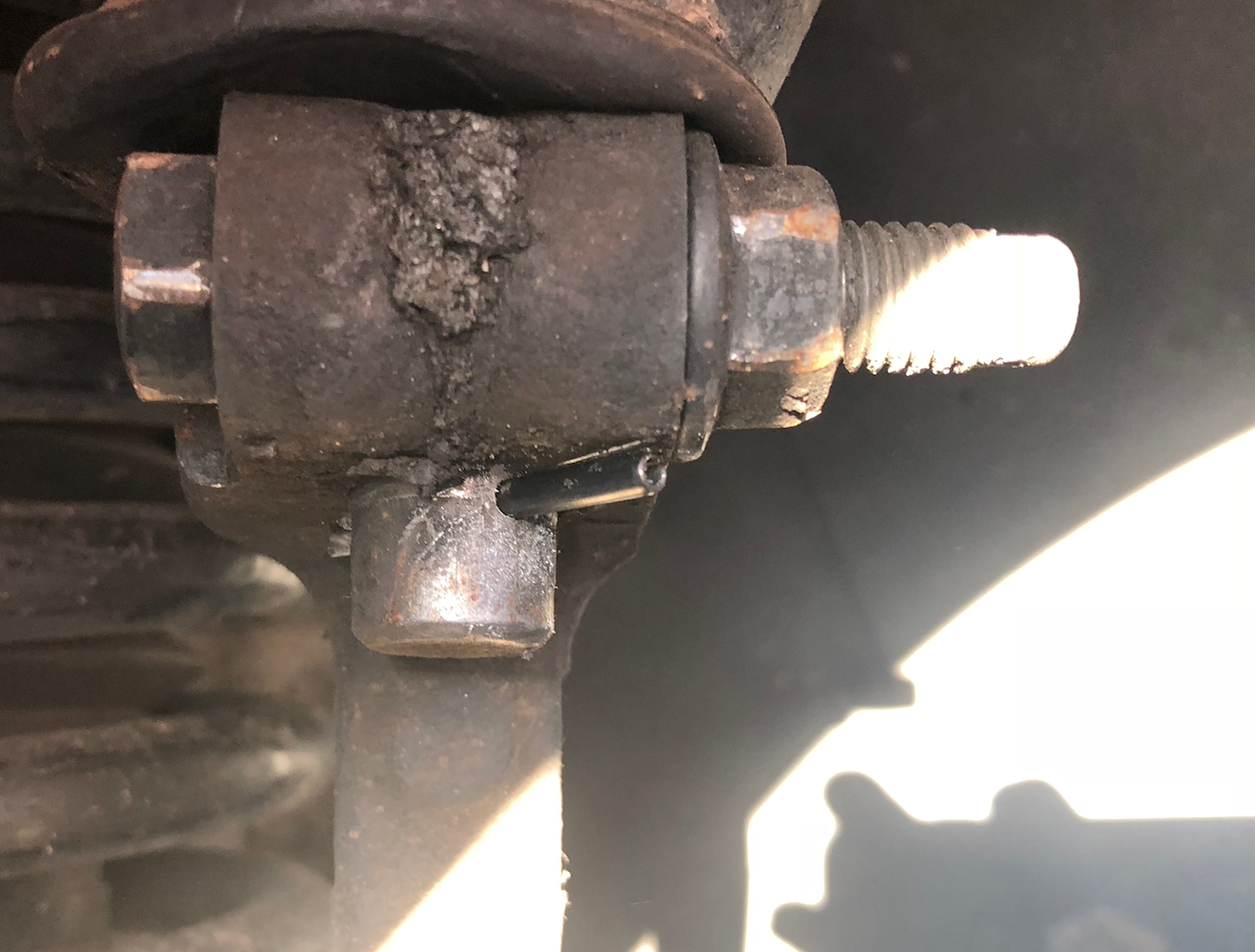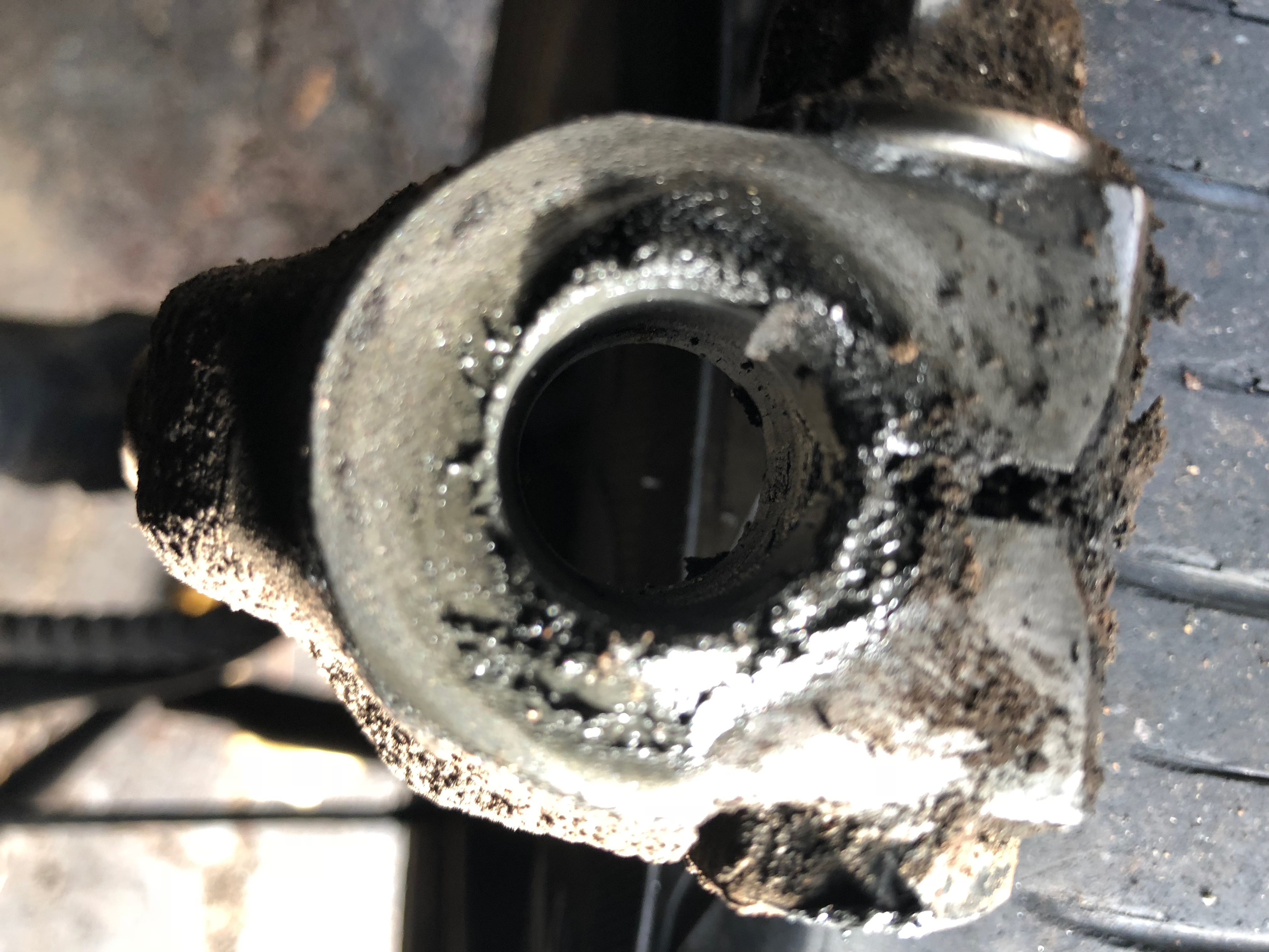 Next day I lifted the car to take the wheel and tire off to get a closer look. I see the cross bolt is still there and the now covered with grease stud is there unbroken. Clean it all up with some brake clean and again nothing looks too out of place except the cross bolts threads intersect with the stud. Then I see the threads have been mashed by the stud pulling out past them.