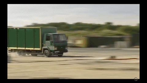 So the 2nd Gif goes all the way to a slow motion after the hit! Much better that way so you can see what everyone was waiting for when they see the truck Gif just stop before it hit the barrier!